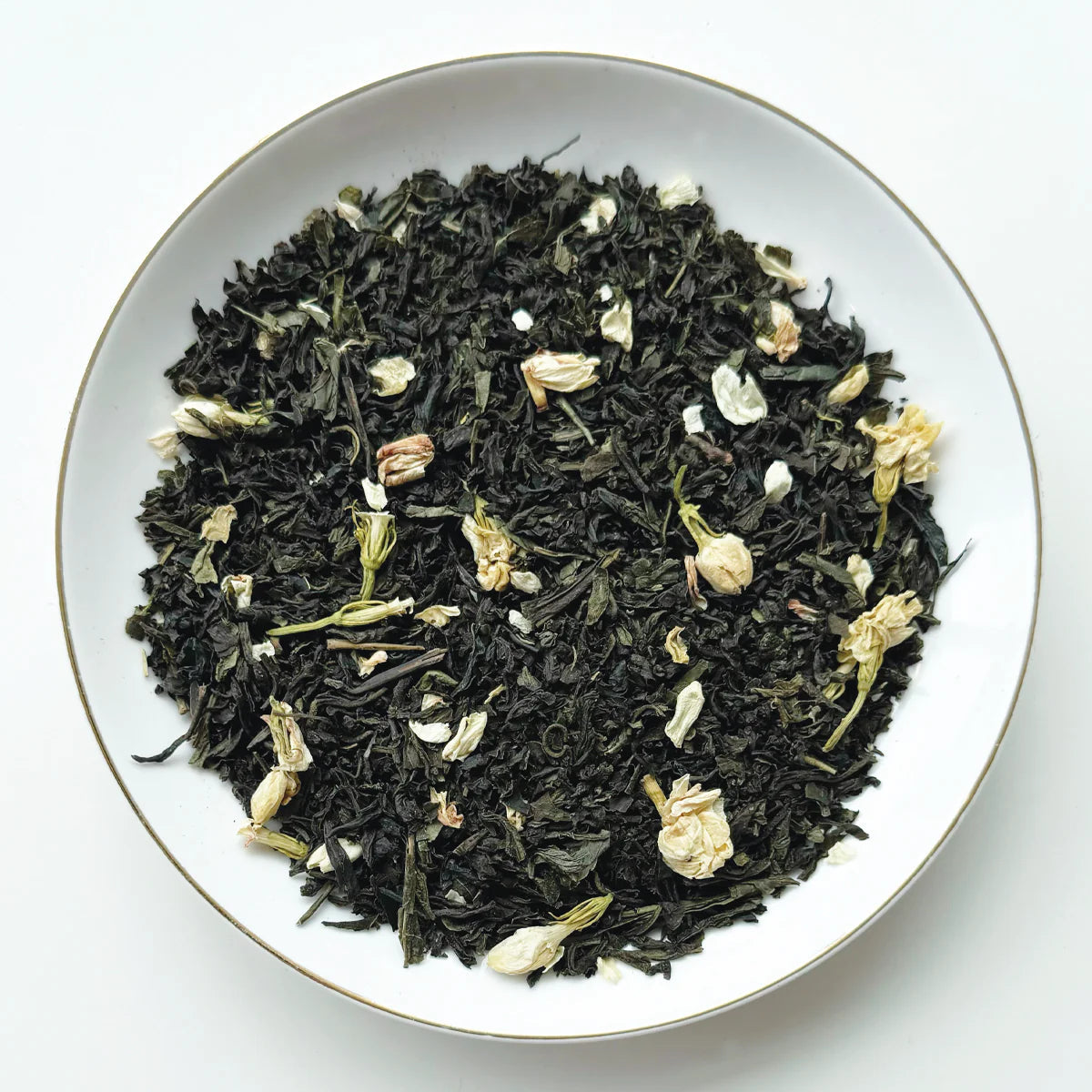 Le thé vert, réputé pour ses nombreux bienfaits pour la santé, est associé aux pétales de jasmin, créant ainsi un équilibre entre la douceur florale et la légère astringence caractéristique du thé vert.