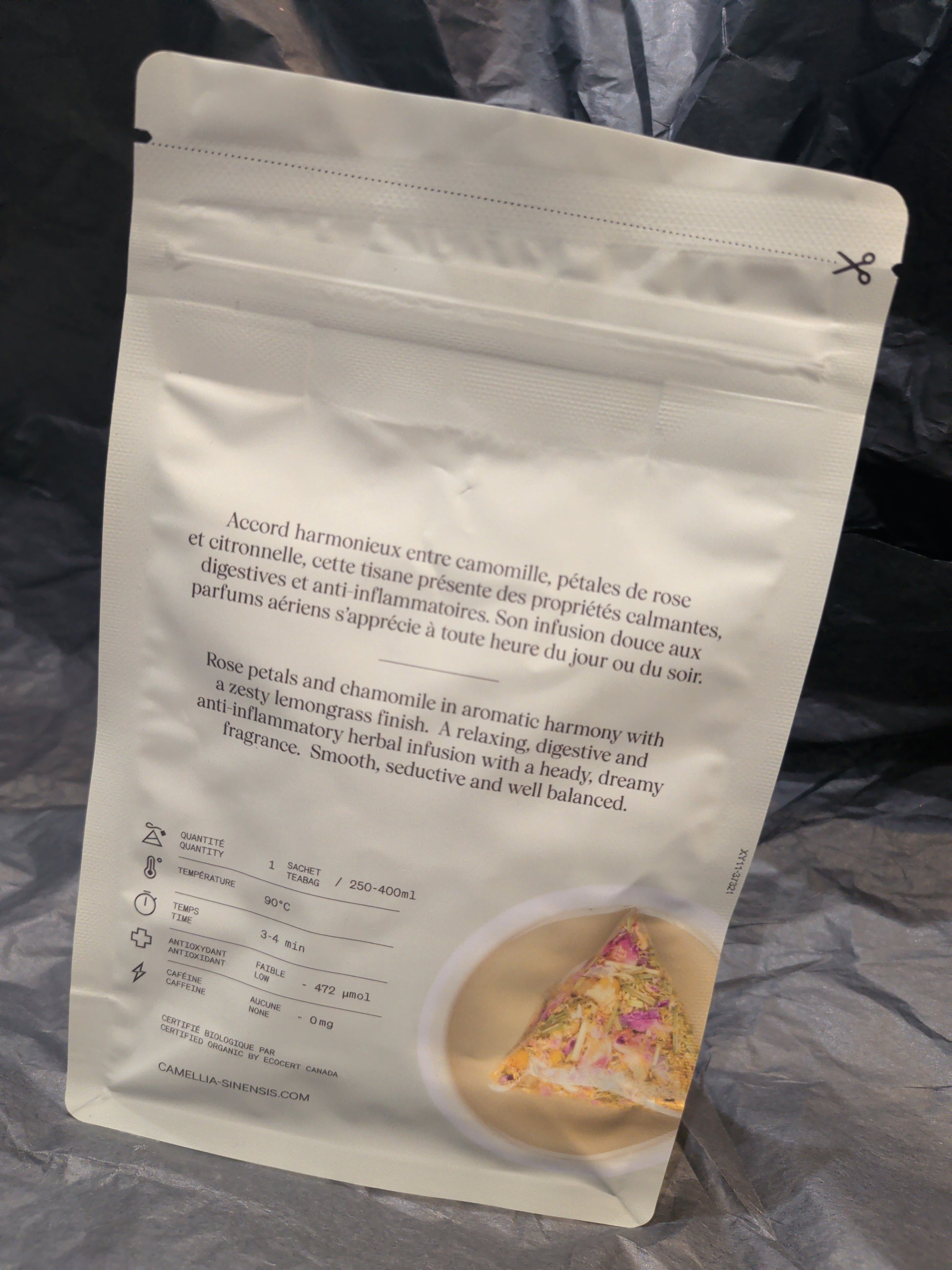 Accord harmonieux entre camomille, pétale de rose et citronnelle, cette tisane présente des propriétés calmantes, digestives et anti-inflammatoires. Son infusion douce au parfum aérien s'apprécie à toute heure du jour ou du soir.